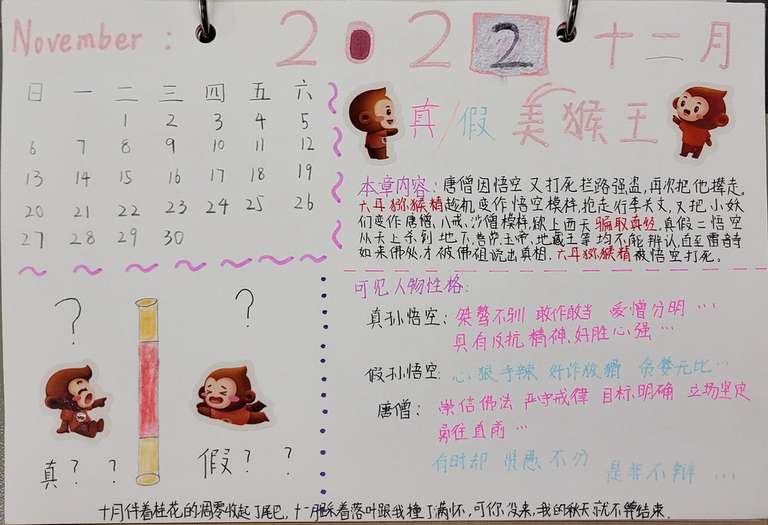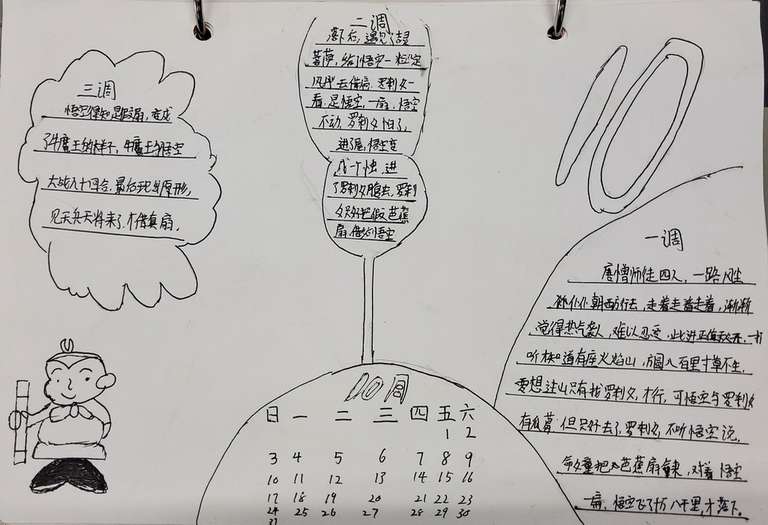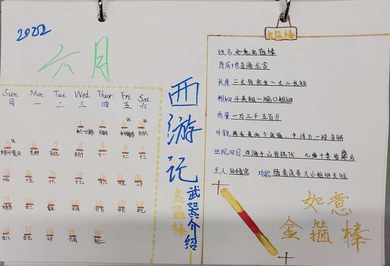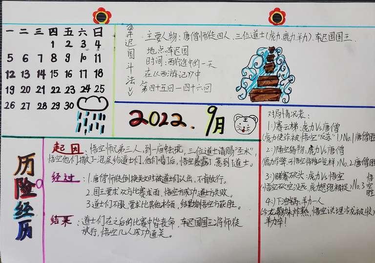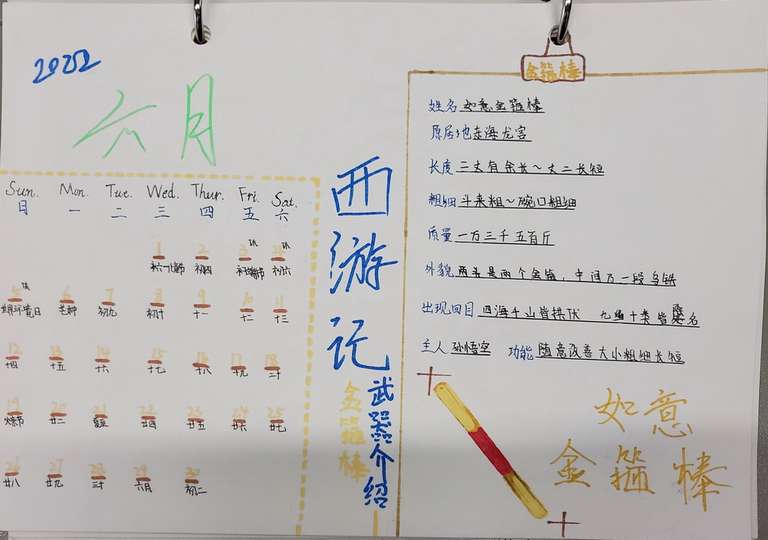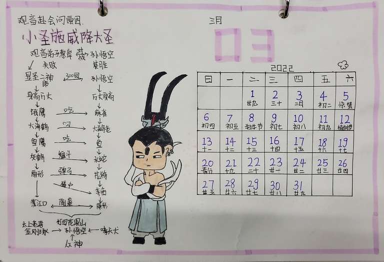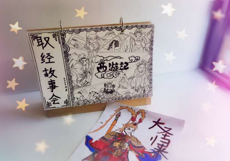 阅读活动极大调动了学生的阅读积极性,大家纷纷表示意犹未尽。于是,在相关活动基础上,我们共同探讨定下《取经故事会2022台历》的衍生活动安排。最后在所有作品中,选择优秀作品组成四份2022台历,这里展示其中最精彩的两份。