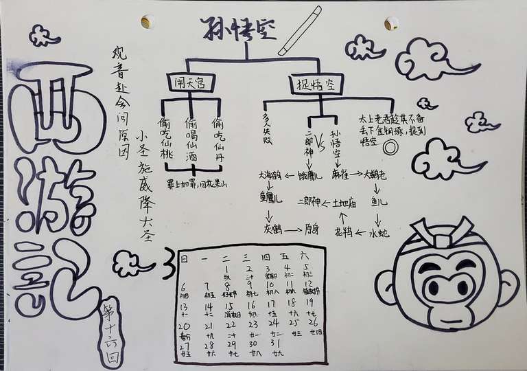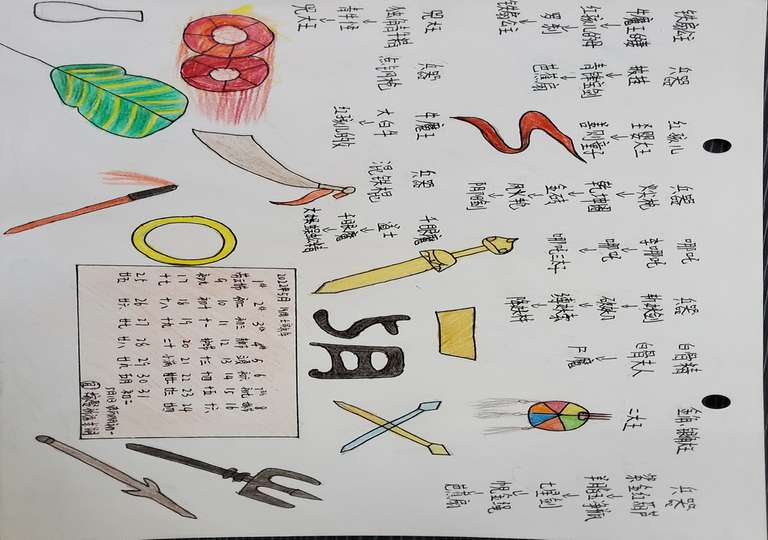 1.思维导图设计:围绕主要情节、妖魔一家、西游记武器图谱等内容制作思维导图;